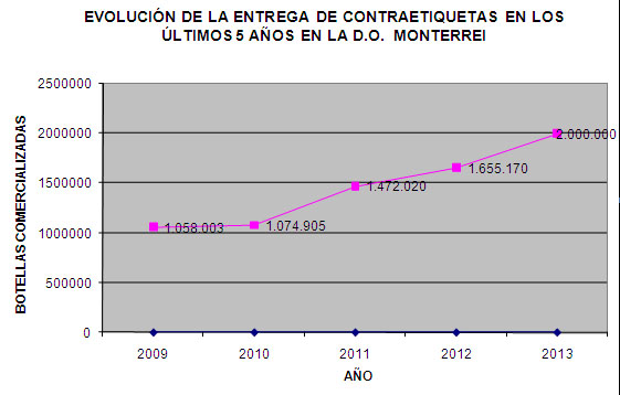 Joven y de gran proyección, éste podría ser el balance tras el análisis de la gráfica de la D.O. Monterrei, que ha llegado a duplicar las cifras de comercialización frente a 2009. Este crecimiento en volumen ha ido en paralelo al incremento del número de productores, que ha pasado de cuatro bodegas en 1999 a las 23 actuales.