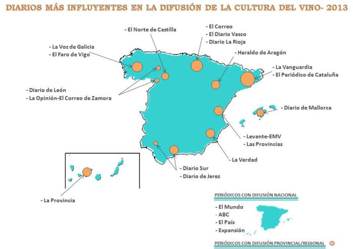 Noticias, críticas y comentarios aparecidos en las 52 revistas, 99 periódicos y más de 300 ediciones territoriales objeto del seguimiento, de entre los que destacan por el número de informaciones referidas al vino el diario ABC, seguido de El País y El Mundo y periodistas tan influyentes como Juan Fernandez‐Cuesta y Carlos Delgado, que encabezan el ranking de escritores sobre la materia a nivel nacional, con Nieves Caballero, Javier Perez‐Andres y Alberto Gil como principales periodistas en prensa regional y provincial.