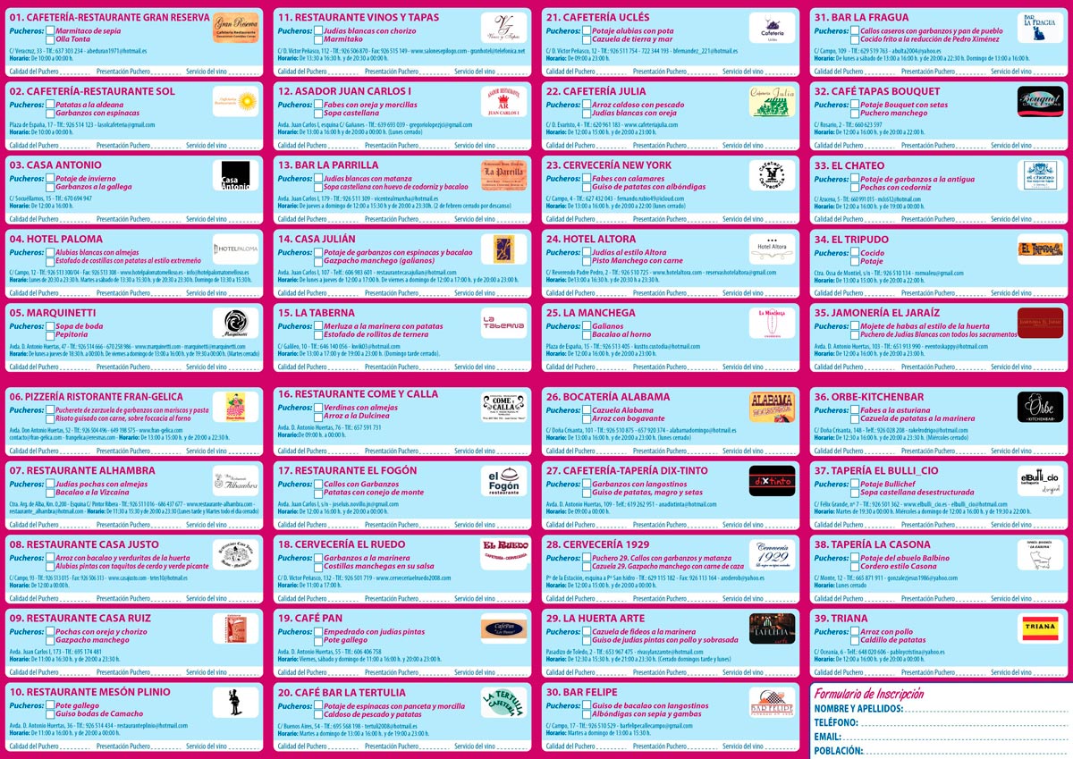 Por parte de los 39 restaurantes y bares participantes, ofrecen cada uno dos pucheros a concurso que serán armonizados necesariamente con los vinos de las bodegas participantes, todas ellas locales y siempre a un precio de 2,5 euros el "puchero" y la copa de vino.