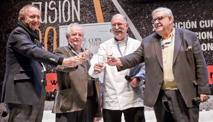 Sobre el escenario, los protagonistas brindaron por un futuro prometedor con una copa de vino de Jerez. Un brindis simbólico con el que el Consejo Regulador de vinos de Jerez, ha querido arrancar la sexta edición de la competición internacional de maridaje gastronómico Copa Jerez.