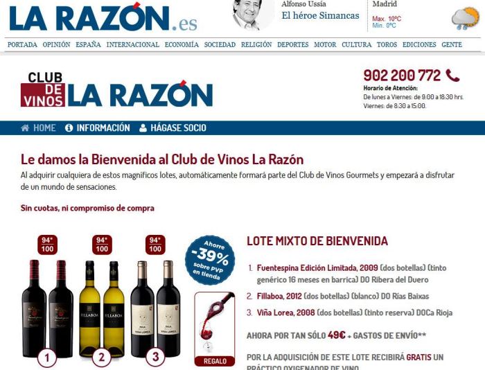 Con el acuerdo entre el La Razón y el Club de Vinos Gourmets, los usuarios del periódico pueden disfrutar de estos vinos y de otras interesantes ofertas puntuales a través de las inserciones que se publican en el diario (versión papel o digital), adhiriéndose a este selecto Club de Vinos La Razón sin cuotas ni compromisos de compra.