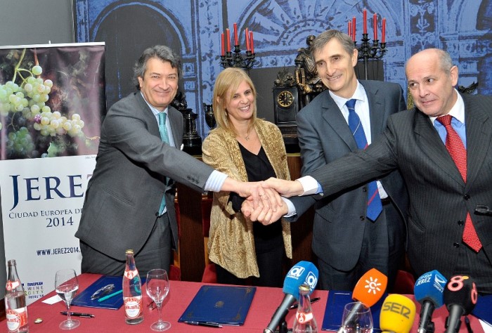 María José García-Pelayo Jurado, Alcaldesa de Jerez de la Frontera, César Saldaña, Presidente de la Ruta del Vino y Brandy del Marco de Jerez, Javier Pages, Presidente de la FEV y Domingo Valiente, Secretario General de FIVIN, han firmado el convenio por el cual la el ayuntamiento jerezano se compromete a la difusión del principal mensaje común de moderación. Así como a cumplir el código de Autorregulación en Materia de Publicidad y Comunicaciones Comerciales de la Federación Española del Vino.