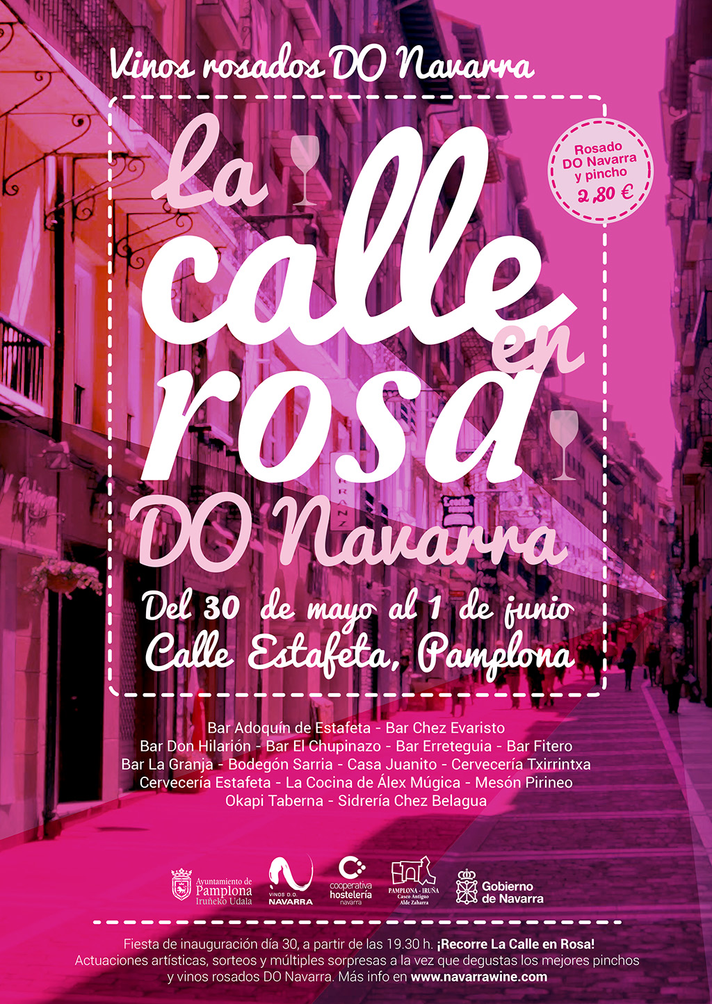 La Denominación de Origen Navarra teñirá de rosa la calle Estafeta de Pamplona el fin de semana del 30 de mayo al 1 de junio. La Calle en Rosa es la fiesta de rosados D.O. Navarra en la ciudad a la que le acompañará una promoción de un vino rosado Navarra y pincho al precio de 2,80 euros en los bares: La Cocina de Álex Múgica, Mesón Pirineo, Okapi Taberna, Bodegón Sarría, Sidrería Chez Belagua, Bar Erreteguia, Cervecería Estafeta, Don Hilarión, Bar Fitero, Bar Chez Evaristo, Bar La Granja, Bar Adoquín de Estafeta, Casa Juanito, Bar El Chupinazo y Cervecería Txirrintxa.