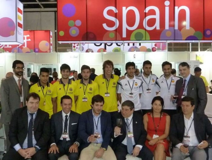 Una delegación de la Liga de Fútbol Profesional (LFP) formada por jugadores del Valencia C.F. y del Villareal C.F.,ha visitado hoy el Pabellón de Vinos de España en Vinexpo Hong Kong 2014 y ha podido conocer de primera mano el trabajo y el buen hacer de las 36 bodegas participantes.