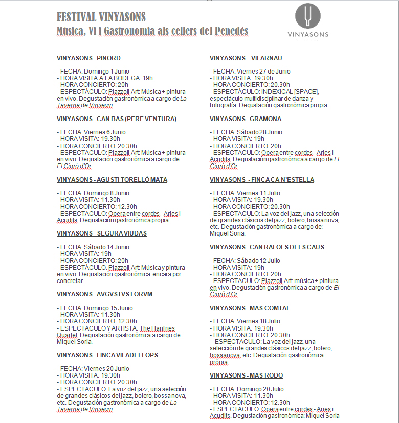 VinyaSons está organizado por la Orquesta de Cámara del Penedès (orquesta residente en el Auditorio Municipal de Vilafranca) y presenta 5 de itinerarios musicales diferentes que contempla sonidos y actividades diferentes.