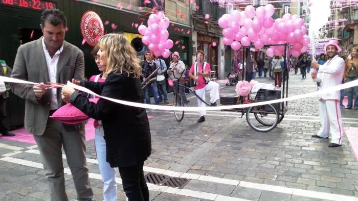 El corte oficial de una cinta rosa inauguraba la primera edición de la Calle en Rosa en la Estafeta de Pamplona, el evento que pone en valor los vinos rosados de la Denominación de Origen Navarra. A continuación, la música y la animación supusieron el estallido de la verbena. En la fiesta participaron artistas de diferentes disciplinas. Los cientos de asistentes que allí se dieron cita disfrutaron de la melodía del tango, la animación de una "brass band", los malabares circenses y la intervención pictórica que se elaboró durante el evento. Éste fue el inicio de un fin de semana en el que una de las calles más emblemáticas de Pamplona, la Estafeta, se teñía de rosa con una decoración festiva para celebrar el rosado Navarra.