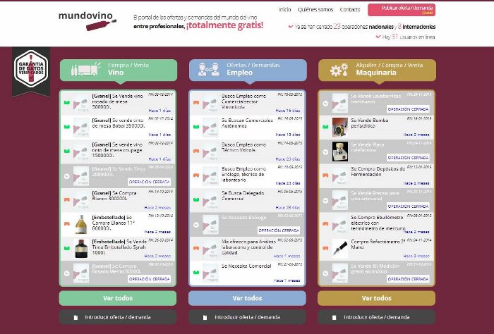 Ahora, la nueva plataforma MundoVino.com, portal de ofertas y demandas del sector vinícola, ha visto aumentada su facturación en un 200% en el último año y cada vez son más los intermediarios que apuestan por usar las tecnologías para encontrar ofertas y demandas que aseguren el éxito de sus clientes.