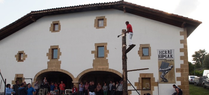 Mendibile Jauregia, el palacio de Leioa sede del consejo regulador de la Denominación de Origen Txakoli de Bizkaia, ha abierto la exposición "18 deportes vascos" de Herri-kirolak, que mostrará hasta mediados del próximo mes de octubre los utensilios (piedras de más de 1.500 kilos, hachas, sierras, guadañas, yunques, carro, sogas, o sacos de fardo), junto con fotografías, pinturas y vídeos de campeonatos de los más afamados representantes del deporte rural vasco de los últimos 30 años. Algunos de ellos como los harrijasotzailes Inaxio Perurena y Joseba Ostolaza; los aizkolaris Angel Arrospide y Fausto Mugerza, los especialistas en yunque, Jon Lapazaran y levantamiento de fardo, José Miguel Bustinza, realizaron una exhibición para la apertura de esta exposición.