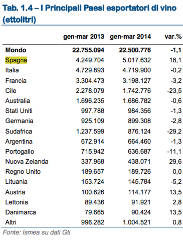 El informe destaca a España como primer vendedor mundial de vino en el periodo enero‐marzo de 2014, según datos recogidos de GTI. Ya hablábamos días atrás de la buena salud de nuestras exportaciones, que registraban una subida del 20%.