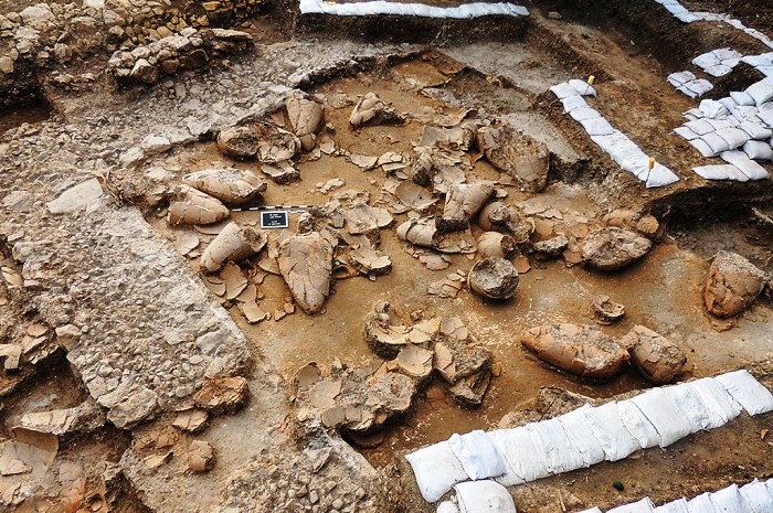 El descubrimiento se produjo el año pasado cuando al oeste del patio central de la estructura los centíficos desenterraron cuarenta grandes recipientes de vino.