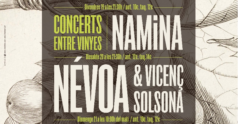 El maridaje definitivo de música, vino y gastronomía. Viernes 19 a las 21.30h, concierto entre viñas con NAMINA, una de las voces más singulares del país. Acercando el jazz a la canción de autor y el soul a la bossanova, y citando en un mismo repertorio a Nina Simone, Sam Cooke, Maria Mercè Marçal, Joan Vinyoli y Chris Isaak. Sábado 20 a las 21.30h, concierto entre viñas con NÉVOA+VICENÇ SOLSONA. Núria Piferrer "Névoa", una de las grandes voces del fado, estará acompañada de un guitarrista de largo recorrido como Vicenç Solsona (Bebo Valdés, Paquito D'Rivera, Maria del Mar Bonet, Manolo García). Sofisticación, ternura y emociones a flor de piel. Domingo 21 a las 10.00h, vendimia y ruta musical para participar en familia de una experiencia tan especial como la vendimia y compartir un aperitivo entre las viñas. Todo con la selección musical del periodista Jordi Urpi (Dr. Batonga), una eminencia en músicas de todo el mundo. Una ruta sonora por las tierras del vino, del Mediterráneo a los cinco continentes.