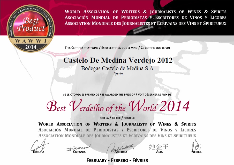 La nominación del Castelo de Medina Verdejo como Mejor Vino Blanco Español y Mejor Verdejo del Mundo viene dada por los 7 galardones internacionales obtenidos en 2013 por este vino, entre los que destacan la Gran Medalla de Oro obtenida en el Concurso Mundial de Bruselas o el Zarcillo de Oro obtenido en los Premios Zarcillo.