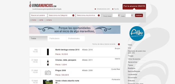 Sencillo e intuitivo, para pequeñas y grandes empresas y, sobre todo, gratuita. Vinoanuncios.com ha conseguido en poco tiempo posicionarse como una herramienta con muchas posibilidades para facilitarle la vida a quien desea encontrar un vino, uva, accesorios, maquinaria, cursos, y todo lo relacionado con este sector. Su responsable, Marcos M Lodeiro, nos cuenta que ya son entre 2.000 y 3.000 las visitas únicas que recibe Vinoanuncios.com cada día, lo que hace que su catálogo de productos aumente.