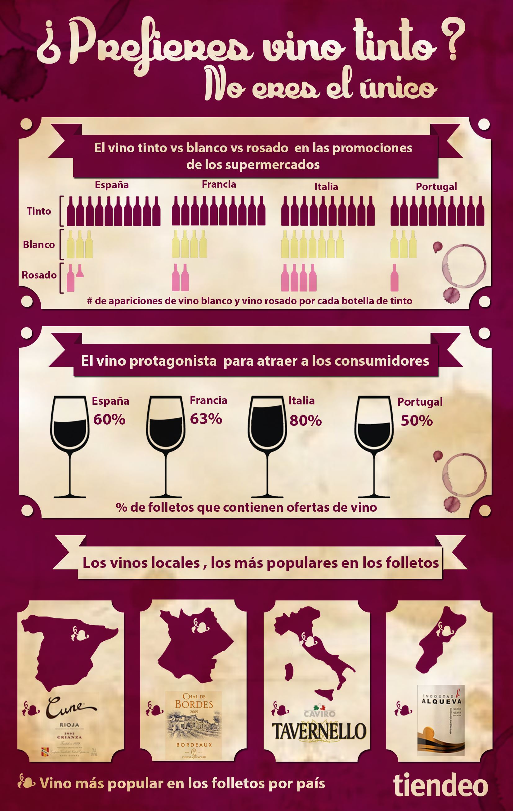 Según un estudio realizado por Tiendeo.com, en España por cada 10 ofertas de vino tinto en los folletos de ofertas, hay 3 de blanco, y solamente 1 de cada 10 son de rosados. Esta tendencia se repite en Italia, Francia y Portugal, donde las ofertas de vino blanco solamente representan una media de 4 por cada 10 ofertas de tinto.