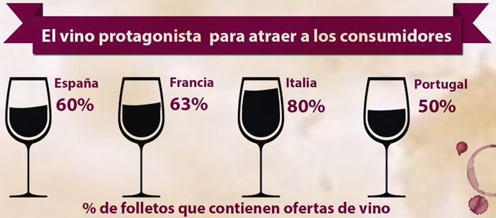 En total, el vino, ya sea tinto o blanco es uno de los productos estrella para atraer a los consumidores. En España el vino está presente en el 60% de los folletos de alimentación, según Tiendeo. Este mismo estudio señala que Italia, Francia y Portugal son otros de los países en los que hay un gran volumen de ofertas de vino en los folletos de retailers de alimentación, con un 63%, un 80% y un 50% de presencia respectivamente.