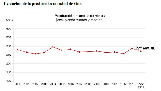 Con un 6% menos en comparación al año anterior, la cifra se queda en 271 millones de hl de vino producidos en el año 2014 a nivel mundial.