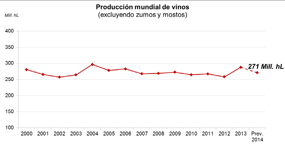 La producción mundial de vinos, excluyendo zumos y mostos, alcanzaría los 271 Mill. hL, un retroceso de un 6 % en relación a 2013, según las primeras estimaciones de la OIV para 2014.