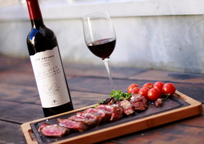 MadriDajes propone disfrutar de unas chuletas de ternera de primera calidad, alimentada exclusivamente con pasto y cereales, procedente del cruce de raza avileña con charolesa. Las cualidades de la ya conocida como “carne de la felicidad” se potencian y complementan con el Initio 2008 un vino elaborado con la variedad garnacha, limpio, brillante y de color rojo picota de alta capa. Presenta en nariz una gran complejidad en cuanto a aromas -confituras de moras, ciruelas pasas, azahar, regalices y plantas aromáticas silvestres-. En boca se muestra vivo, elegante, amplio y estructurado, con una prolongada persistencia.