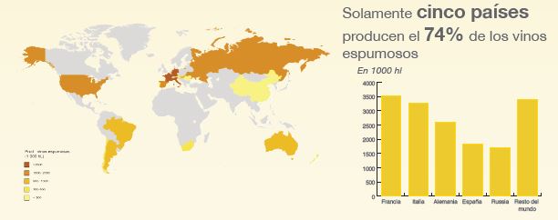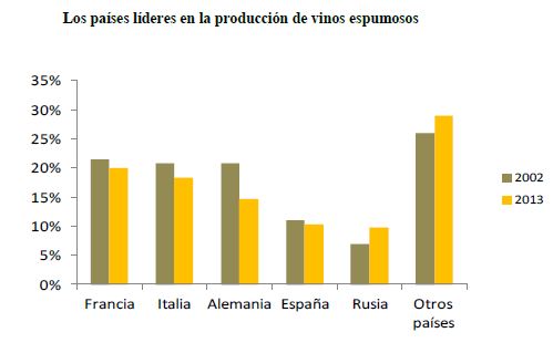 Siguen a la cabeza países como Francia, Italia, Alemania, España y después Rusia aunque se empieza a ver el crecimiento de países como Australia, EEUU, Argentina o Brasil. Esto significa que sólo cinco países producen el 74% de los vinos espumosos. Aun así la producción de vinos espumosos respecto al resto de vinos aún es baja, representa el 7% de la producción mundial, aunque en el año 2000 la cuota sólo representaba un 4%. España produce 1,8 mill hL según el método tradicional, aún lejos de Francia, Alemania e Italia.