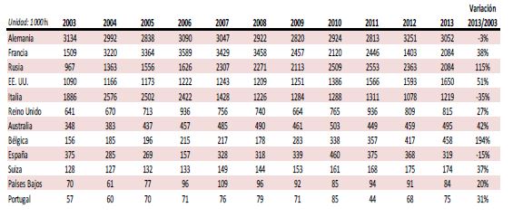 En España estamos lejos de la cabeza de países líderes en consumo de vinos espumosos, dónde Alemania lidera y Francia y Rusia le siguen a partes iguales. Destacar la posición de Rusia y el crecimiento de EEUU.