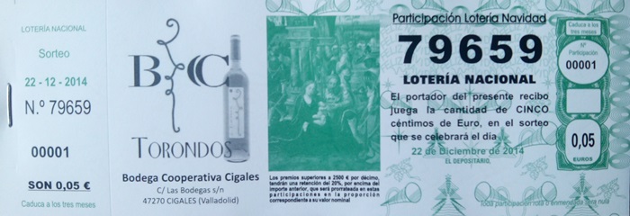 La Bodega Cooperativa "Torondos" de Cigales ha lanzado una novedosa campaña para estas próximas fechas en 11 bares y restaurantes de Cigales y 22 del Paseo Zorrila de Valladolid donde a partir del día 21 de noviembre por cada vino Torondos Rosado, Tinto o Blanco que se consuma en los establecimientos participantes los clientes recibirán una participación de lotería de Navidad valorada en 0,05 € (1000 € de premio en caso de ser agraciado con el premio gordo)