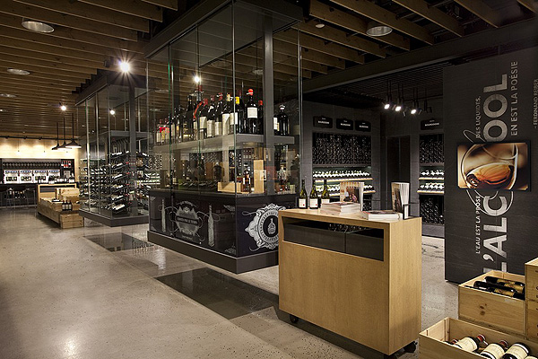 El estudio Sid Lee Architecture, rediseñó para la firma abanderada de gama alta Société des alcools du Québec (SAQ), la antigua tienda museo que dificultaba nuevas posibilidades en el mercado. Sid Lee, trabajó en el concepto de “caminar hasta la bodega“, manteniendo la imagen de sus vinos exclusivos y de prestigio, pero con un toque de modernidad inspirado en las bodegas de los castillos franceses tradicionales, es decir, iluminación tenue y temperatura ambiente, acompañado de tipografía e información detallada de todos sus productos. Más ejemplos de tiendas de vinos de diseño en Nueva York, Hong Kong, Burdeos o Budapest.