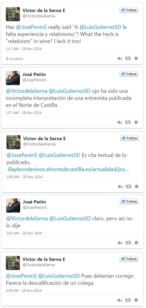 José Peñín, en una conversación en Twitter con el periodista del diario El Mundo, Víctor de la Serna, afirma que se trata de "una incompleta interpretación de una entrevista publicada en el Norte de Castilla" además añade "así no lo dije". Por su parte, Víctor de la Serna afirma en inglés "¿Qué diablos es el relativismo en el vino? A mi también me falta".
