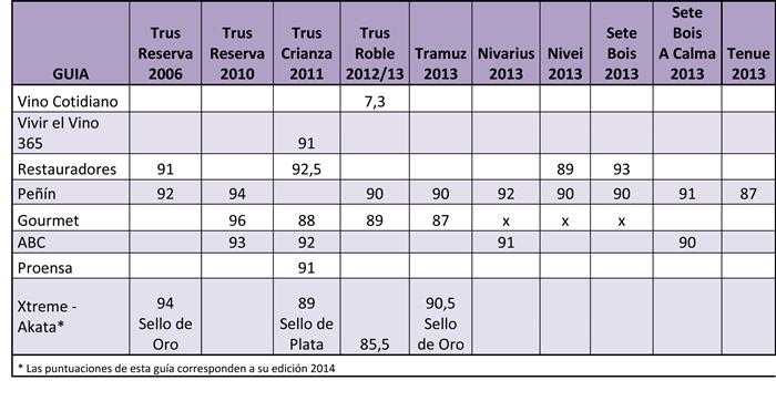 Las principales guías de vino españolas avalan la calidad de los vinos elaborados por el grupo Palacios Vinoteca, ya que de los 10 vinos presentados en estas guías, 9 están calificados con altas puntuaciones en las ediciones de 2015 de las mismas.