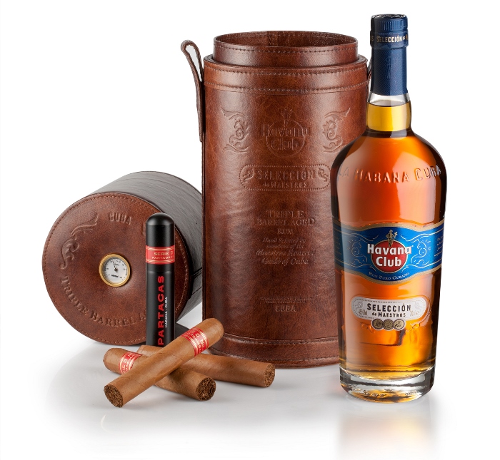 El espectacular estuche de cuero grabado contiene en su interior a la gran protagonista: la botella de ron Havana Club Selección de Maestros. Una vez se destapa y se sirve, el estuche conserva en el mejor estado posible los puros Habanos, pues su interior forrado en madera de cedro, su esponja capaz de retener la humedad y la hermeticidad lo convierten en un perfecto humidor de puros. Incluyendo también en la tapa un hidrómetro que mide la temperatura interior. Y ¿cuál sería un maridaje perfecto? Havana Selección de Maestros y unos puros Habanos Partagas Serie D No.4.