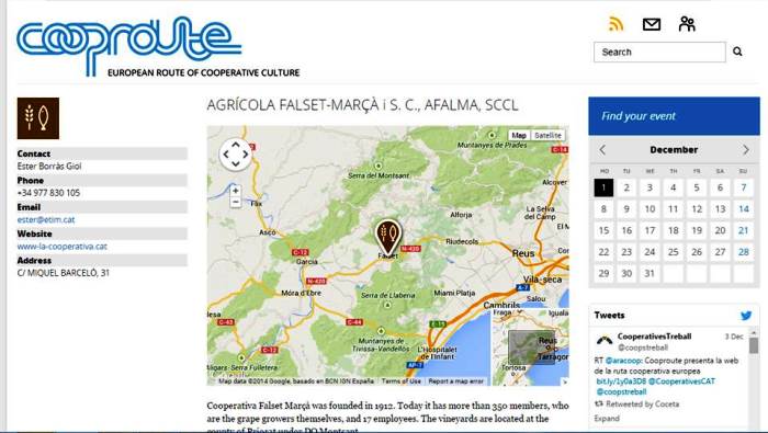 Uno de los apartados destacados de la web de Cooproute es la explicación de cómo la bodega promueve los valores cooperativos y hace hincapié en la herencia recibida de los antepasados que pervive en la manera de trabajar las tierras y elaborar vinos, en el espíritu de los agricultores y socios, además de poner en valor un edificio único que fue construido hace casi 100 años y que sigue siendo un espacio de trabajo en la actualidad. El gerente de la Cooperativa, Xavi Domènech, reiteró que es un orgullo para los socios cooperativistas formar parte de la ruta transnacional europea y que debe servir para "dar un revulsivo a la actividad enoturística de la Cooperativa, uno de los pilares de la bodega, y atraer visitantes del extranjero sobre todo de los países en los que se exporta el vino de la bodega de la DO Montsant ". Domenech reconoce que es una participación ilusionante que permite observar desde toda Europa un proyecto vitivinícola cimentado en la combinación de la historia y la modernidad.