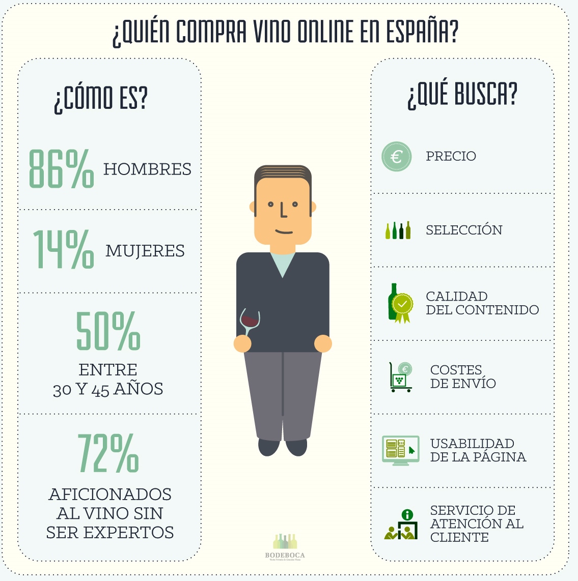 Según un estudio de la tienda de comercio electrónico Bodeboca, el retrato robot del comprador español de vino online en España es un hombre (86%) de entre 30 y 45 años (50%) aficionado al vino sin ser experto (72%) que fuera del canal online compra también en tiendas especializadas (75%), en las propias bodegas (48%) y en supermercados (40%).