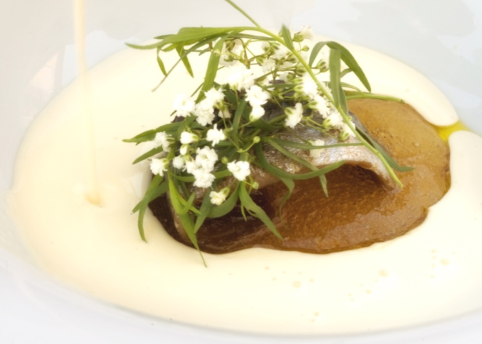 Respecto al maridaje con el plato, 4 de los 7 magníficos combinan a la perfección, ya que la perfecta acidez de los vinos, así como su sabor seductor, limpiarían bien la grasa de la sardina, la untuosidad del ajoblanco y el gel de Verdejo. Además, la acompaña muy bien aromáticamente con los herbáceos del plato.