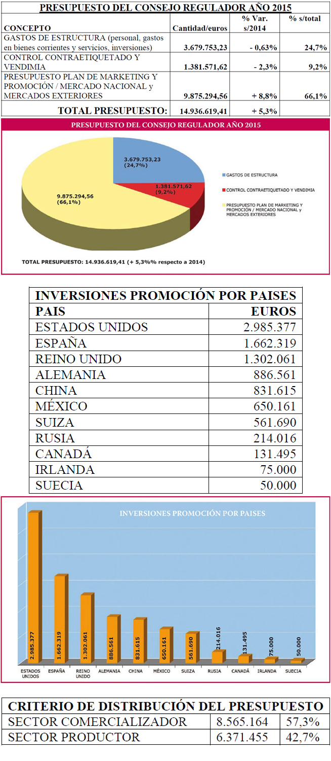 La distribución del presupuesto del Consejo para 2015 entre los dos sectores, cuyas aportaciones por kg de uva y por botella de vino se han mantenido prácticamente estables estos años, se realizará siguiendo los criterios tradicionales. En lo que se refiere al presupuesto ordinario y adicional de 5,9 millones de euros, la aportación del sector comercializador será del 68,5% y la del sector productor del 31,5%, mientras que el presupuesto extraordinario de promoción (9 millones de euros) se distribuirá al 50% entre ambos sectores.