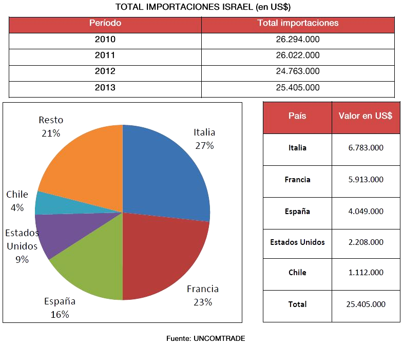 Respecto a sus importaciones, en Israel se observa la misma tendencia que en el resto del mundo, con Italia dominando como proveedor seguido de Francia y España.