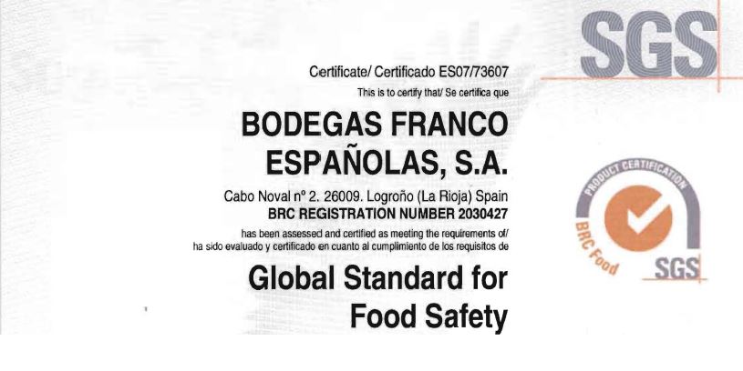 Bodegas Franco Españolas acaba de renovar la Certificación BRC Global Standard for Food Safety dada por el Consorcio Británico de venta al público con el nivel más alto que puede conseguir. El certificado esta referido, específicamente, al sistema de gestión de la calidad y la seguridad alimentaria para el tratamiento, tipificación, crianza y embotellado de sus vinos. Dicha acreditación garantiza que la calidad implantada en la bodega está a los niveles más altos que establece el marco internacional.