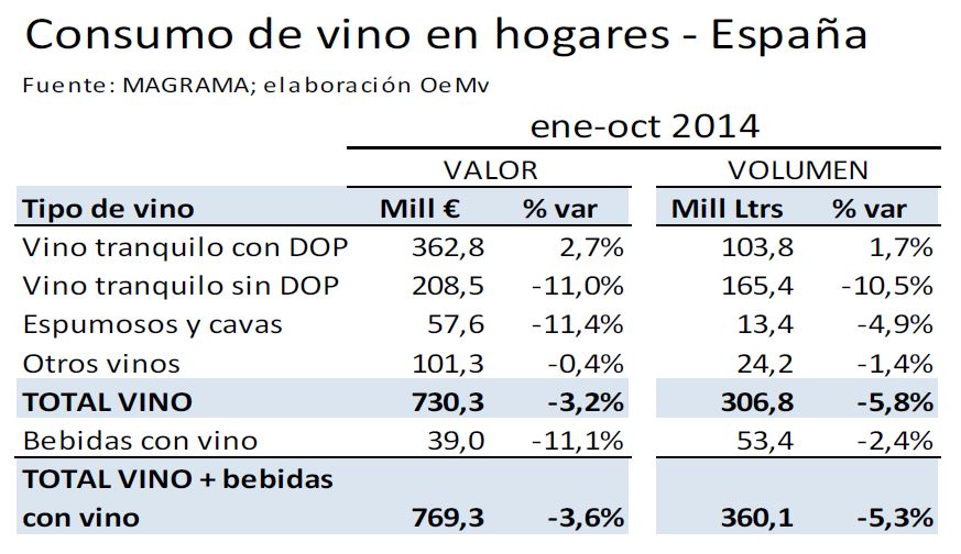 Según los datos recién publicados por el Ministerio de Agricultura, Alimentación y Medio Ambiente (MAGRAMA) en su panel de consumo alimentario con datos hasta octubre de 2014, crece el consumo de vino con denominación de origen (DOP) en los hogares españoles, un 1,7% en volumen, hasta los 103,8 millones de litros en los diez primeros meses de 2014.
