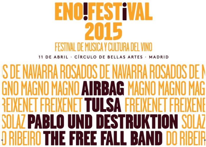 El enoFestival 2015 ya tiene fecha y primeras bandas confirmadas, será el sábado 11 de abril con un cartel tan ecléctico como de costumbre, que de momento incluye a Airbag, Tulsa, Pablo und Destruktion y The Free Fall Band.