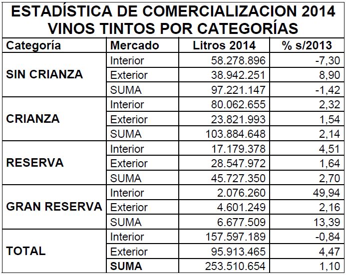 Los vinos de Rioja han seguido la tendencia positiva iniciada en 2013 y, de acuerdo con el balance final ofrecido por el Consejo Regulador, las ventas han sumado en 2014 un aumento de cinco millones de botellas, que sitúa a esta Denominación en un nuevo máximo histórico con un total de 281 millones de litros. La exportación ha seguido tirando de las ventas, aunque a un ritmo algo menor (+3,6%) que los años anteriores, y los vinos con crianza en barrica, junto a los blancos, han concentrado la totalidad del crecimiento (+2,66% y +13,67% respectivamente). El mercado español se ha mantenido estable, algo que se valora positivamente dadas las circunstancias económicas y de caída del consumo que le afectan. En síntesis, la D.O. Calificada Rioja ha comercializado en el año 2014 un total de 280.789.424 millones de litros, el 90% de los cuales corresponden a vinos tintos (253,5 M. de l.), repartiéndose el resto los vinos rosados (12,42 M. de l.) y los blancos, que con 14,85 M. de l. son los que han tenido mayor aumento porcentual (13,67%).