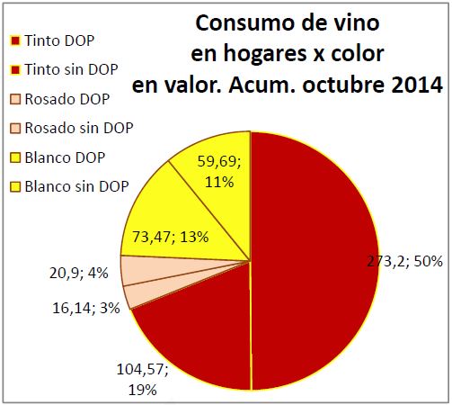 En el acumulado a octubre de 2014, el vino tinto supuso el 75,3% del gasto en vinos en los hogares españoles y el 74,7% del volumen total consumido de vinos con DOP en el canal alimentación; y el 56,5% del gasto y el 55,2% del volumen total consumido de vinos sin DOP.