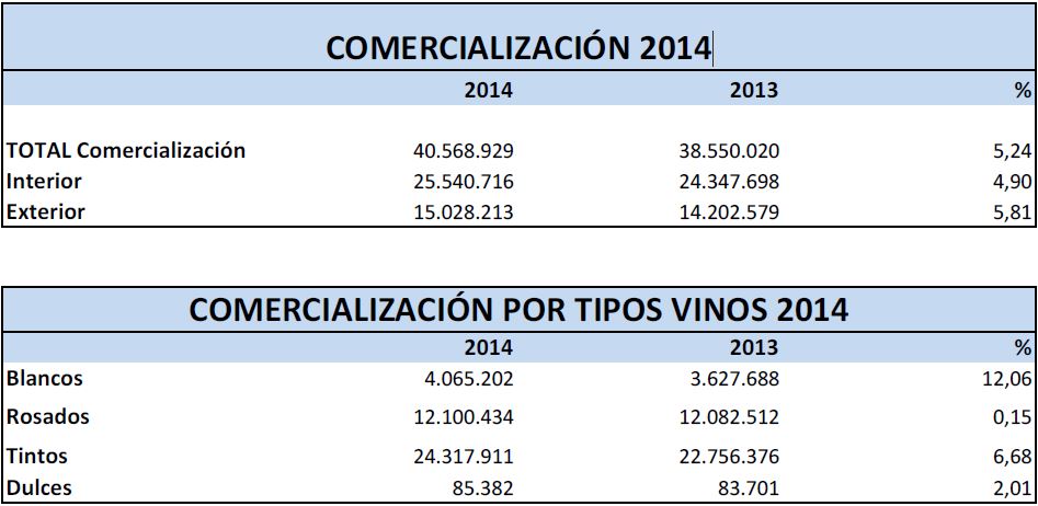 En 2014 se han vendido 24.317.911 litros de vino tinto, 12.100.434 litros de rosado, 4.065.202 litros de blanco y por último, 85.382 litros de vino dulce. El principal incremento lo ha generado el vino blanco con un 12,06%.