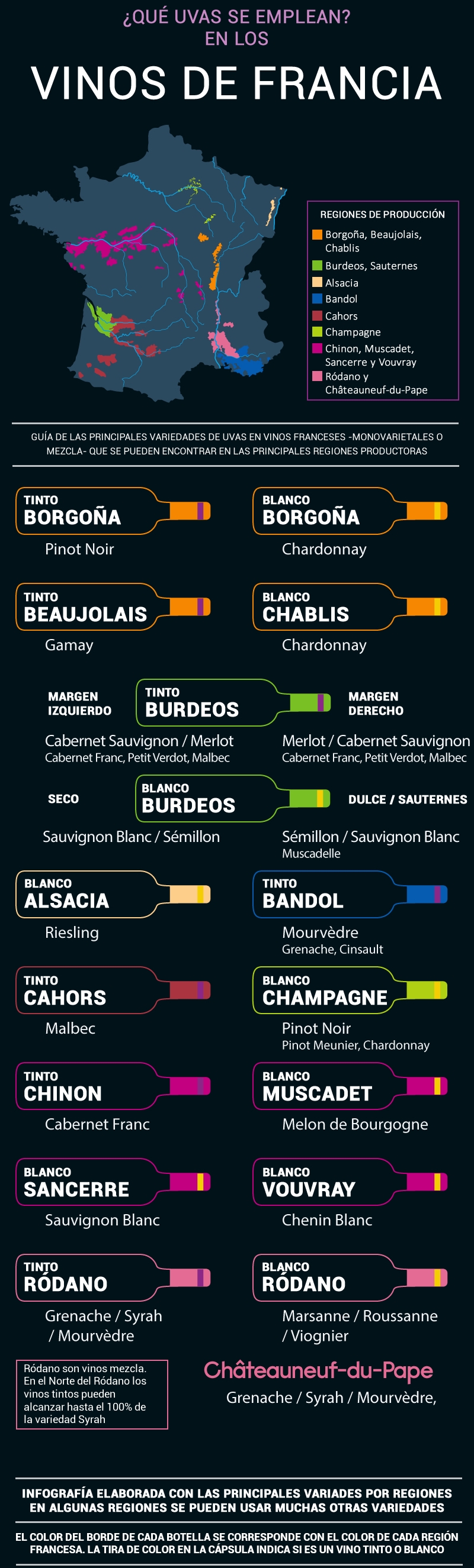 Para ayudar a poner fin a esta confusión hemos creado esta infografía práctica que revela las variedades de uva más habituales que probablemente te encontrarás en los vinos de 15 regiones más populares de Francia.