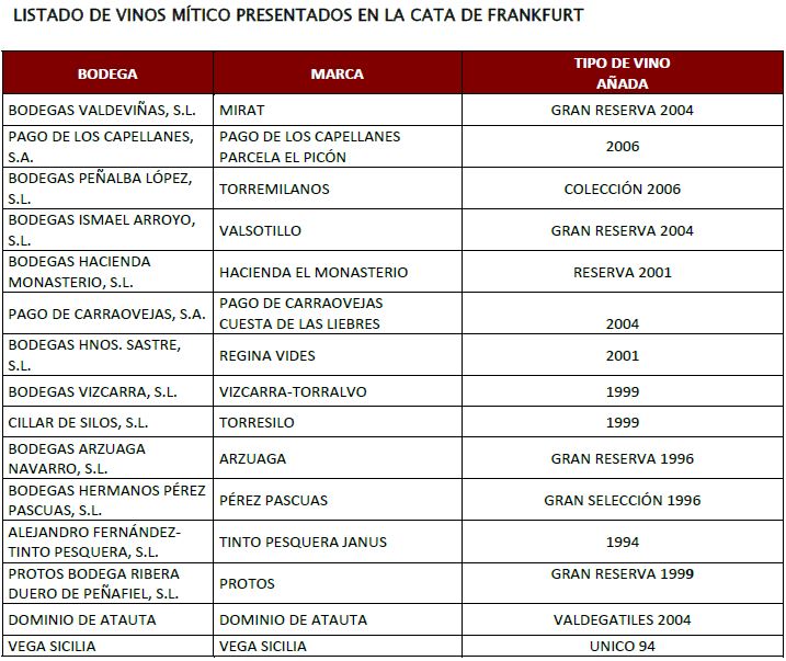 La Cata Mítica de Frankfurt, la primera de esta envergadura que la Denominación de Origen celebra en Alemania, brindó a los participantes la oportunidad de conocer quince vinos con décadas de historia que no se encuentran ya en el mercado, pero que son referentes internacionales de calidad y ejemplos de la potencialidad de la Ribera del Duero tiene. Vinos elaborados por bodegas de todo el territorio de la DO, como el Mirat Gran Reserva 2004, de Bodegas Valdeviñas; el Protos Gran Reserva 1999, de Bodegas Protos; o el Pago Capellanes Parcela El Picón 2006, de Bodega Pago de los Capellanes.