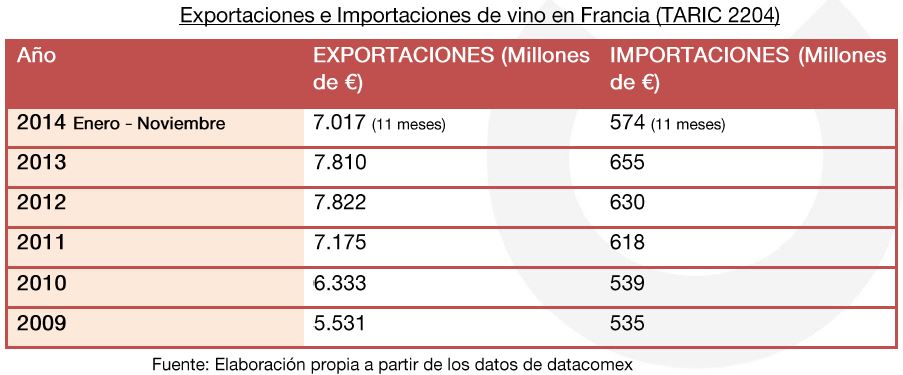 Según datos del último informe comercial del mercado del vino francés elaborado por el ICEX, en 2014 (datos de enero a noviembre) las exportaciones globales de vino aumentaron en Francia un 10% con respecto a 2013, sin embargo la facturación descendió. Así, las exportaciones de vino fueron en 2013 de 7810 millones de euros, mientras que en 2014, a falta de computar el mes de diciembre, se redujo hasta los 7017 millones de euros.