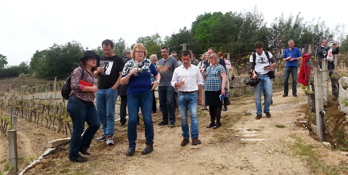 El grupo conoció de primera mano diferentes viñedos, incluyendo catas de vinos propios en cada uno de ellos, para apreciar las diferencias entre terruños, suelos, variedades, elaboraciones, así como de la expresión de la personalidad y filosofía vitivinícola cada uno de los elaboradores. Por ello se visitaron desde nuevas plantaciones que muestran la apuesta de futuro hasta viñedos que datan su origen en el siglo XII. Tras el recorrido por las bodegas y viñedos, Pedro Ballesteros comentó que “estoy viendo una región con mucha gente muy preparada, que ofrece algo único, propio, genuino, que quieren a su tierra y que no quieren parecerse a nadie… El Ribeiro está en plena revolución”.
