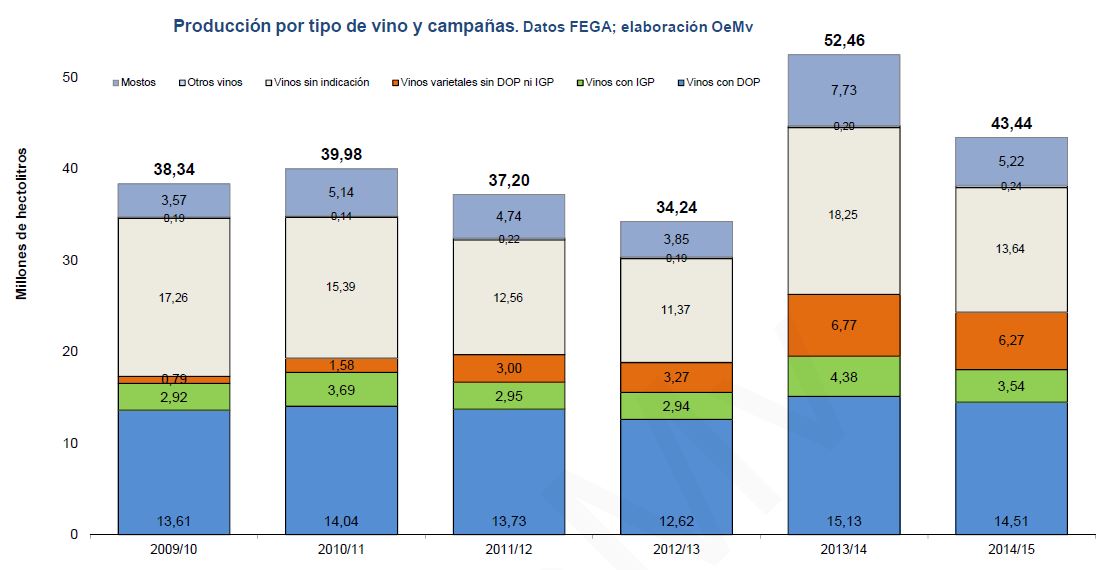 Según datos del Fondo Español de Garantía Agraria (FEGA), analizados por el Observatorio Español del Mercado del Vino (OeMv), la producción declarada por las Comunidades Autónomas en la campaña 2014/2015 ha sido de 43,4 millones de hectolitros de vino y mosto. Con respecto a la campaña anterior, que fue récord, con 52,5 millones de hectolitros producidos, se registra una caída del -17,4%. Se han dejado de producir 9 millones de hectolitros, de los cuales, Castilla-La Mancha ha dejado de producir casi 8 millones y la Comunidad Valenciana, un millón.