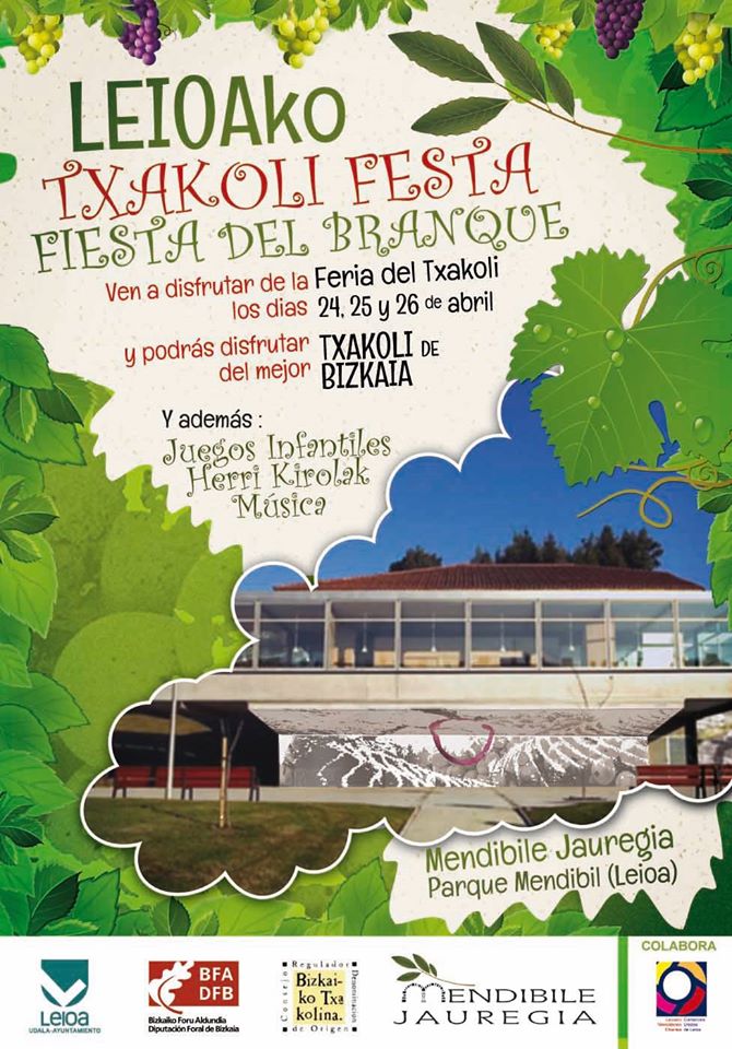 La Asociación Mendibile Jauregia ha organizado para el fin de semana del 24 al 26 de abril la I edición de la fiesta del Branque, Leioako Txakoli Festa, en la que se presentará la nueva añada de txakolis en el palacio de Leioa, sede de la Denominación de Bizkaiko Txakolina.