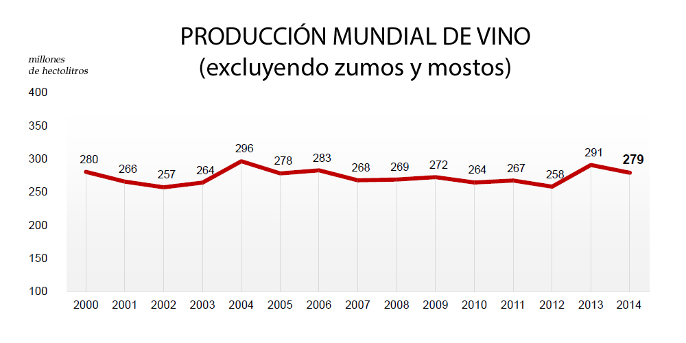 Según los datos presentados esta semana en París por la Organización Internacional de la Viña y el Vino, OIV, se estima una producción mundial de vino en 2014 de 279 millones de hectolitros, que suponen una caída del -4% con respecto a la cosecha récord registrada en 2013 de 291 millones de hectolitros.