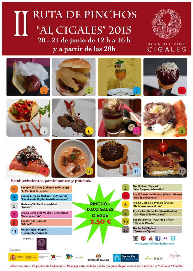 Este evento cuenta con la participación de 12 establecimientos de 6 municipios diferentes: Bar Hacienda Vitulia y Restaurante La Dama de la Motilla de Fuensaldaña; Mesón Cigales, Bar Zocha, Bar las Barricas y Bar El Moral en Cigales; Bodegón el Ciervo y Bodega el Piñero de Cabezón de Pisuerga; Los Tres Navíos de Trigueros del Valle; Restaurante El Sueño del General de Valoria la Buena; Restaurante La Parrilla del Escudero y Restaurante La Casa de la Pradera de la localidad palentina de Dueñas.