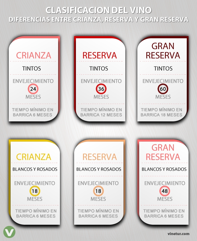 - Vino Gran Reserva: Sólo llegan a esta etapa del envejecimiento las que son consideradas como las mejores cosechas. El tinto deber haber pasado al menos 5 años en bodega de los cuales año y medio es en barricas de madera y el resto en botella. Deben comercializarse en su sexto año. Los vinos rosados y blancos permanecen en la bodega durante cuatro años y al menos seis meses en barricas. Se comercializan también en su sexto año.