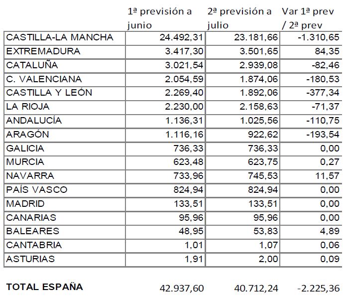 Hay que tener en cuenta y según indica el propio MAGRAMA, que estas cifras son previas al inicio de la cosecha y que podrán verse modificadas a medida que avance la campaña y se vayan actualizando los datos con los proporcionados por las comunidades autónomas.